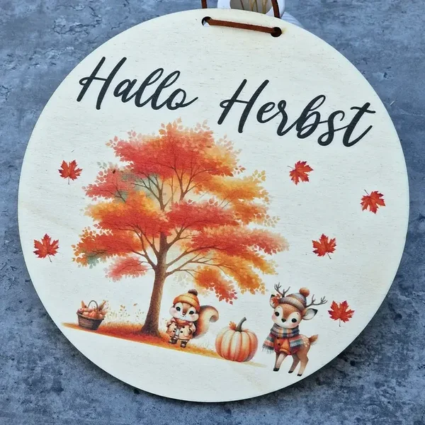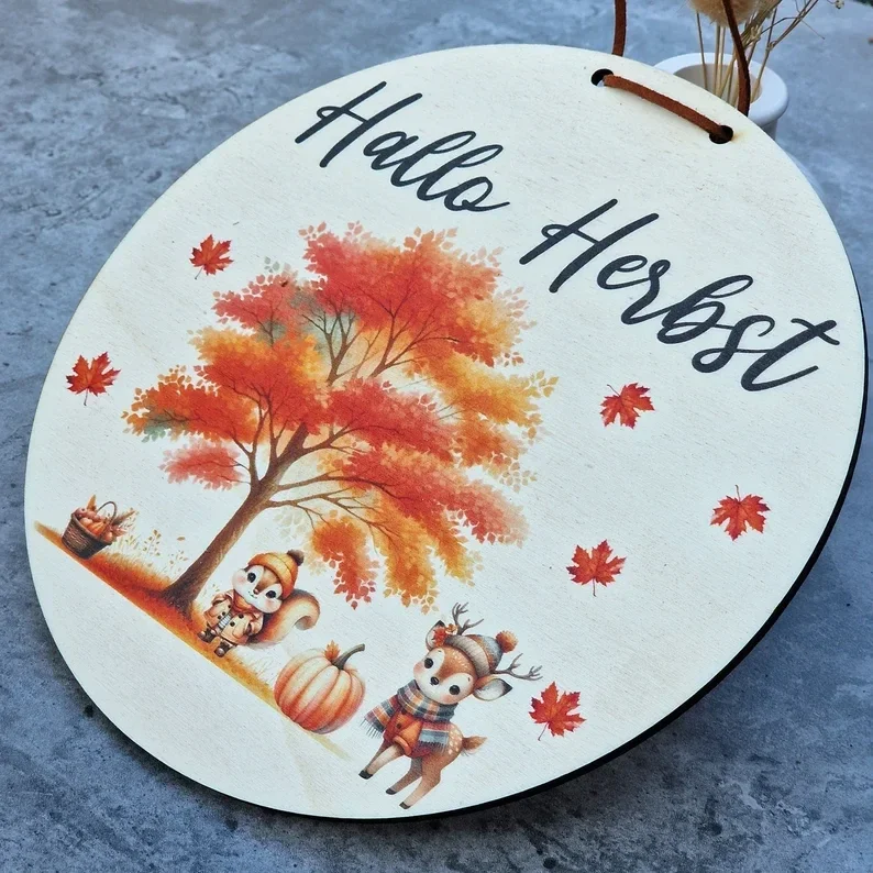 Herbstliche Deko für Zuhause 🍁 Handgemachtes Tür- & Wandschild „Hallo Herbst“ aus Holz (20 cm). Mit liebevollen Motiven wie Laubbaum, Kürbis, Reh, Eichhörnchen und Blättern – perfekt als Herbstdeko oder Geschenk.
