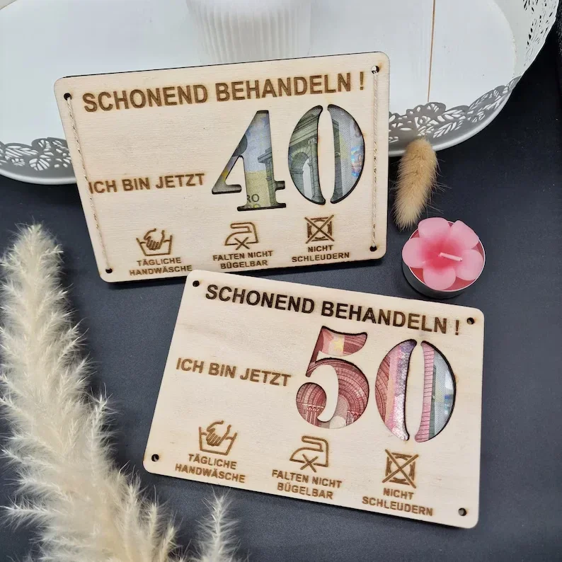 💡 Einfach den Geldschein hinter der ausgelaserten Zahl einlegen, beide Platten mit der mitgelieferten Schnur verbinden – schon entsteht ein individuelles Geschenk, das garantiert Freude bereitet.