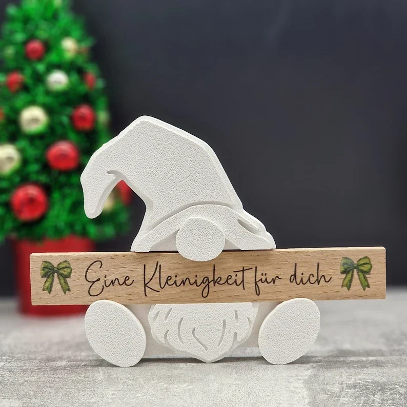 Bedruckte Holzklötzchen & Keramik-Wichtel – handgefertigte Geschenksets