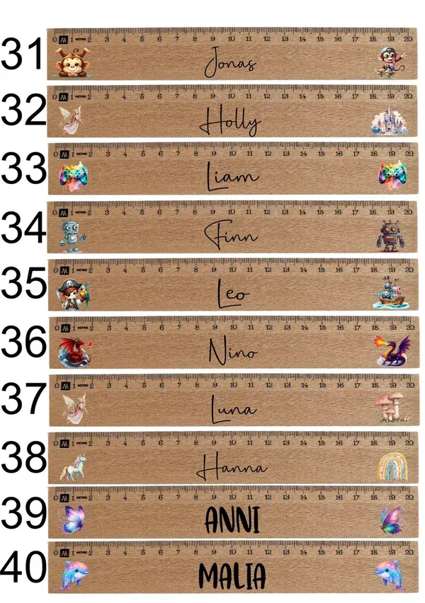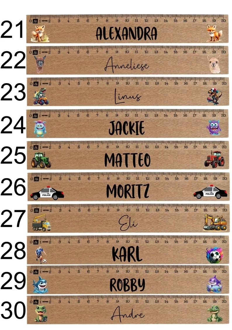 Bereite deinem Kind einen unvergesslichen Schulstart mit diesem personalisierten Holzlineal! Das 21 × 3 cm große Lineal bietet präzise Messungen und wird gleichzeitig zu einem einzigartigen Erinnerungsstück, individuell bedruckt mit dem Namen deines Kindes und einem Lieblingsmotiv.