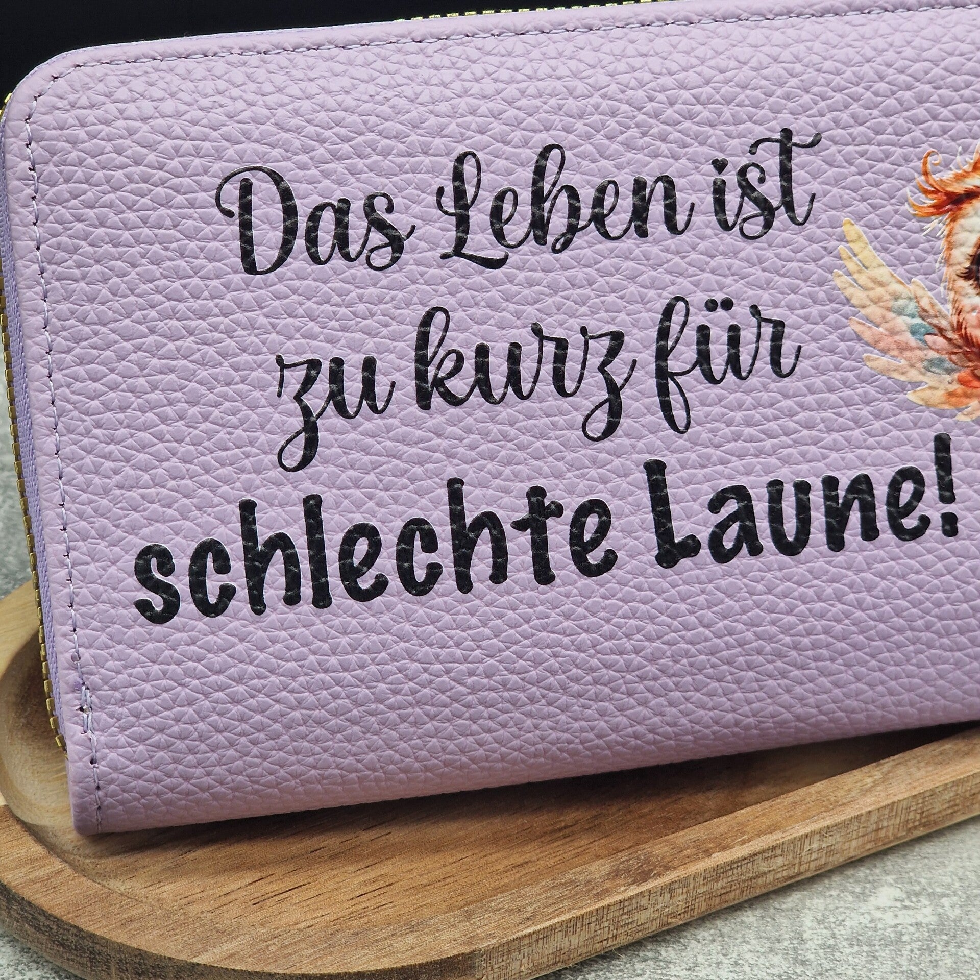 Stylischer Damen Geldbeutel in Flieder mit Eulenmotiv & Spruch „Das Leben ist zu kurz für schlechte Laune!“ 💜 Praktisches Portemonnaie & originelles Geschenk für Frauen mit Humor.