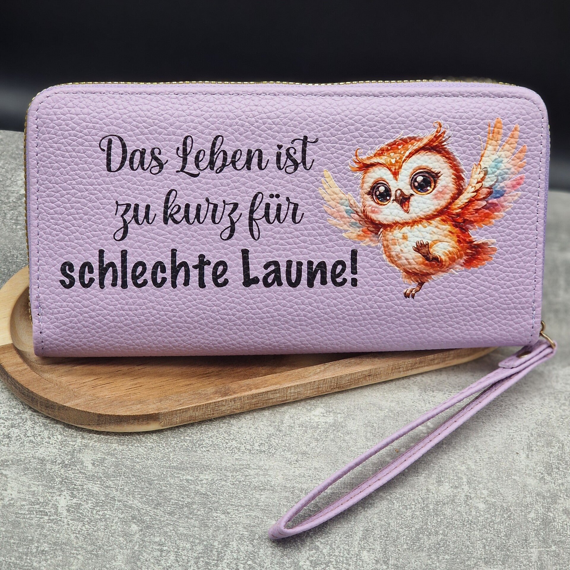 Damen Geldbeutel mit Eulenmotiv & Spruch – „Das Leben ist zu kurz für schlechte Laune!“ – Geschenkidee