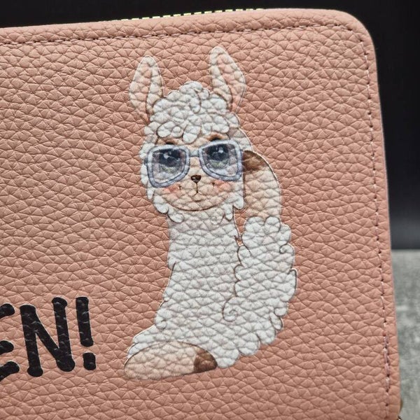 Unser Damen Portemonnaie in Flieder wird mit dem witzigen Spruch „Lächle, du kannst sie nicht alle anspucken!“ und einem süßen Lama-Motiv bedruckt. Perfekt für alle, die Humor lieben und im Alltag ein stylisches Accessoire dabei haben möchten.