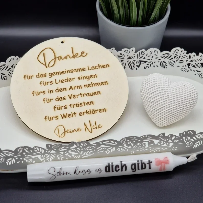 Sag Danke auf eine besondere Art – mit einem handgefertigten Holzaufsteller aus hochwertigem Holz. Jeder Aufsteller wird per Lasergravur individuell verziert und kann mit deinem Wunschtext oder Namen personalisiert werden. So entsteht ein einzigartiges Geschenk, das Wertschätzung und Dankbarkeit ausdrückt.