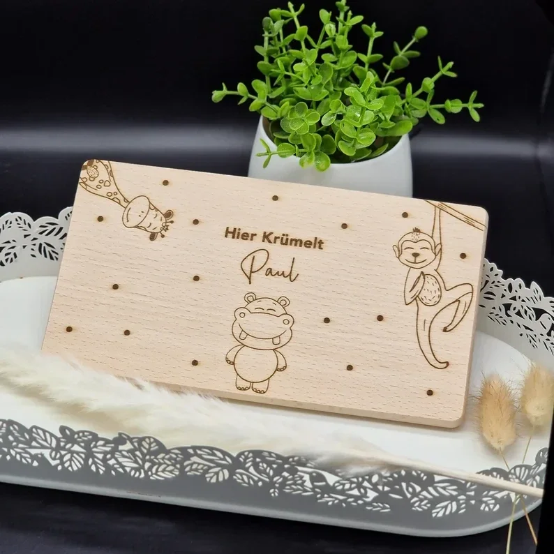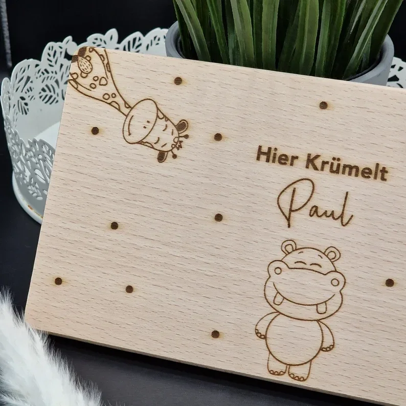 Jedes Brettchen ist durch die natürliche Maserung des Holzes ein einzigartiges Unikat und kann individuell graviert werden. Die Größe beträgt ca. 22 x 12 cm – handlich und praktisch für Kinderhände.