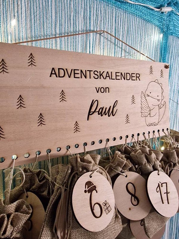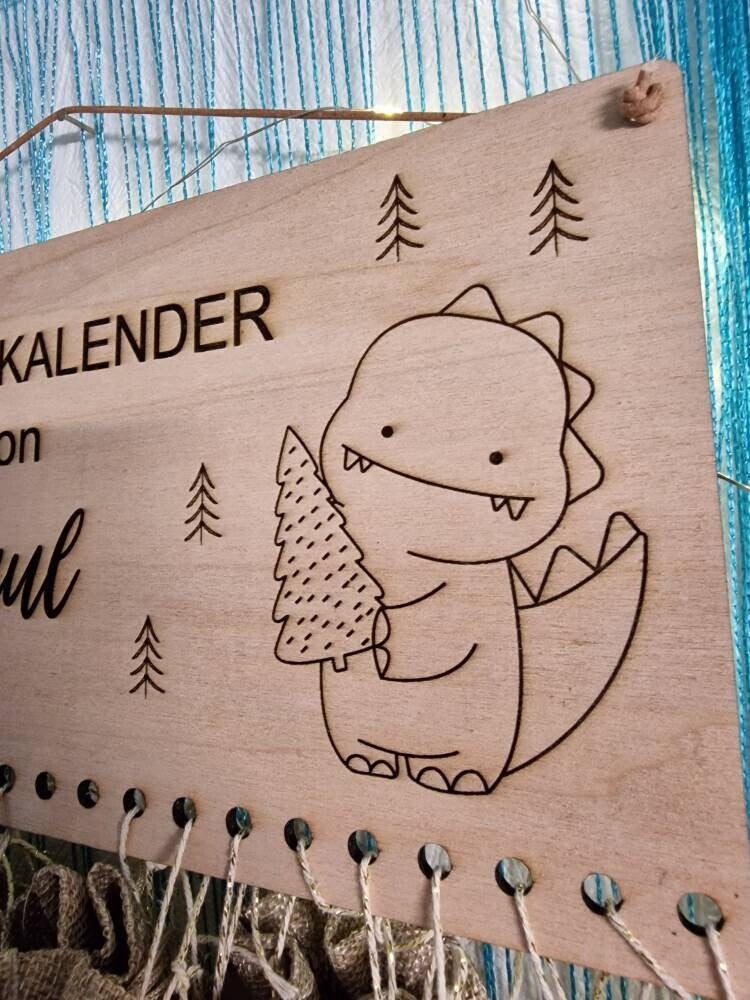 Wähle zwischen Holzschild, Holzschild mit Zahlen oder Komplettset inklusive Jutesäckchen. Mit einer Größe von 36x16 cm und Gravur auf 4 mm starkem Pappelsperrholz ist jeder Kalender ein einzigartiges Unikat – perfekt als Weihnachtsgeschenk für Kinder, Familie oder Baby.