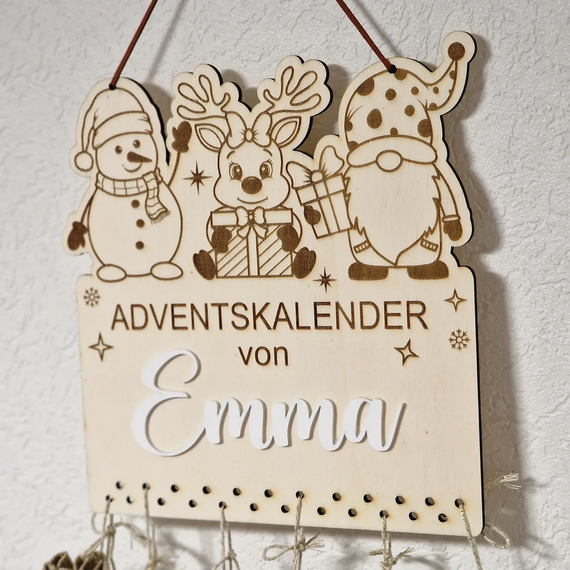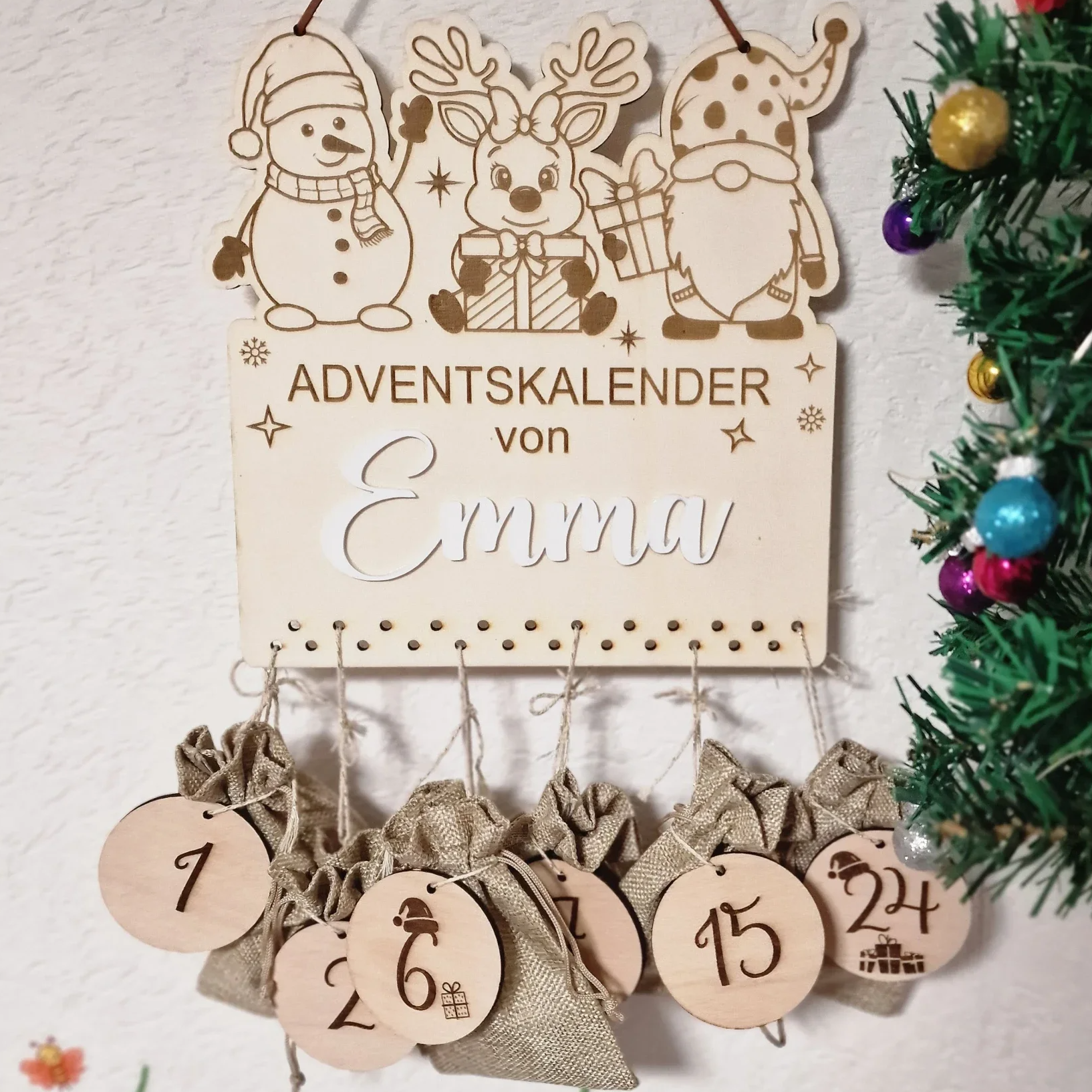 Mache die Vorweihnachtszeit unvergesslich mit diesem personalisierten Adventskalender aus 4 mm Pappelsperrholz! Der Name wird aus Acryl geschnitten und verleiht dem Kalender einen hochwertigen 3D-Effekt. Ideal als Weihnachtsgeschenk für Kinder, zur Dekoration oder zum Befüllen der 24 Jutesäckchen.