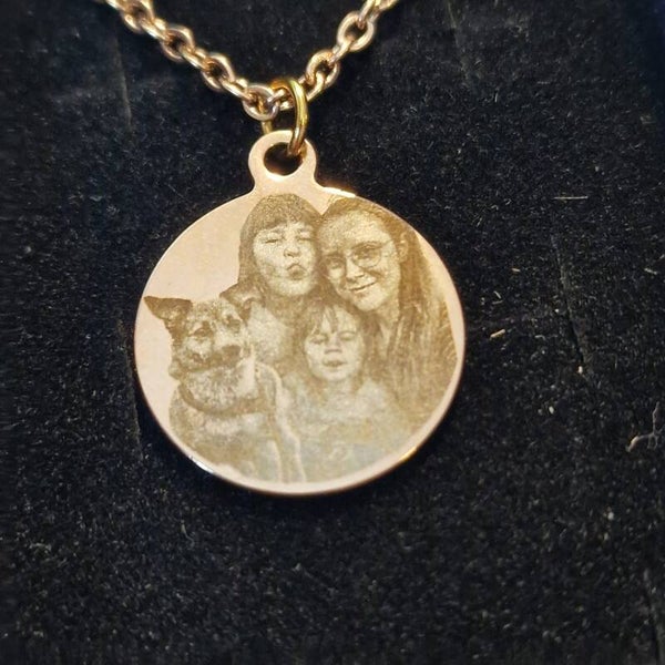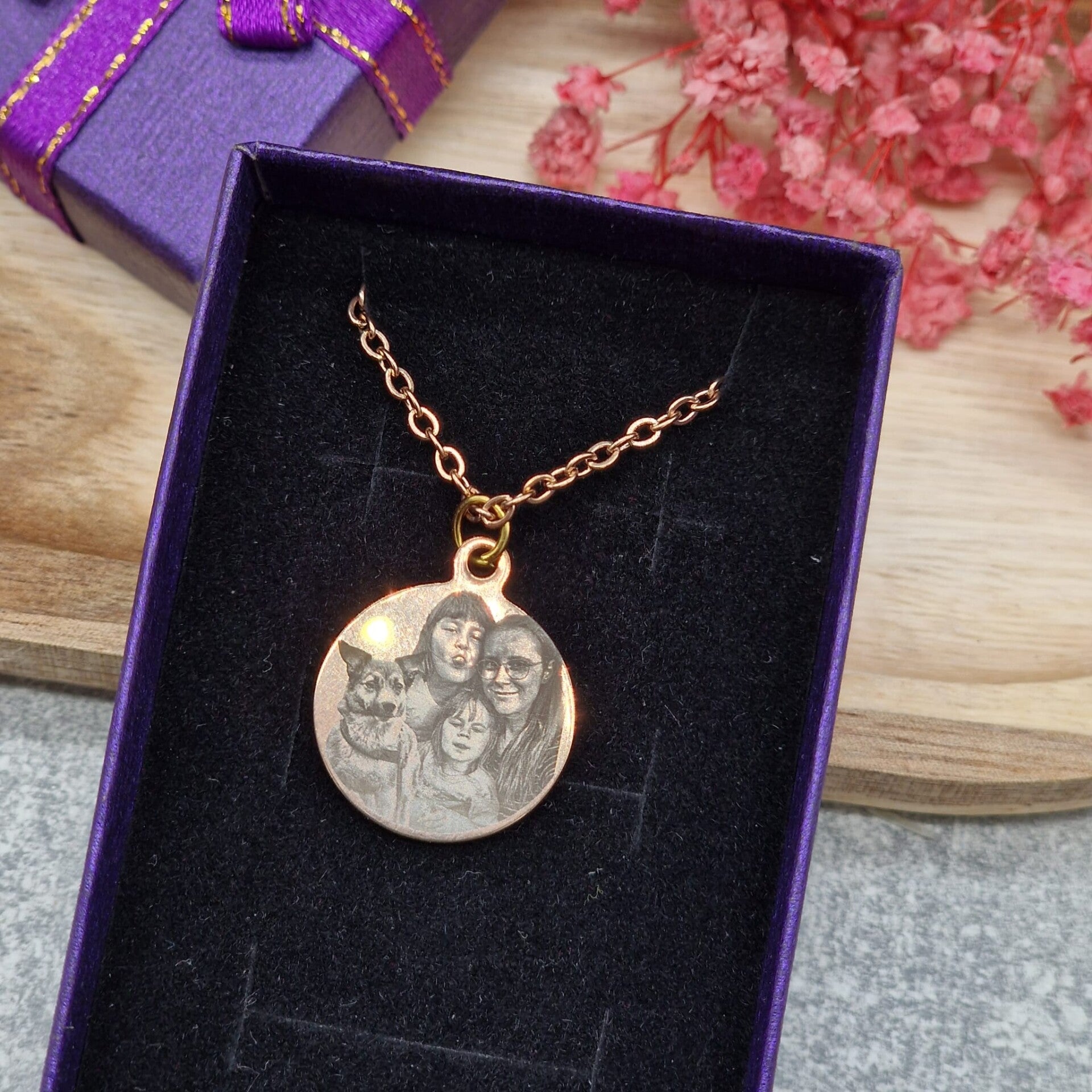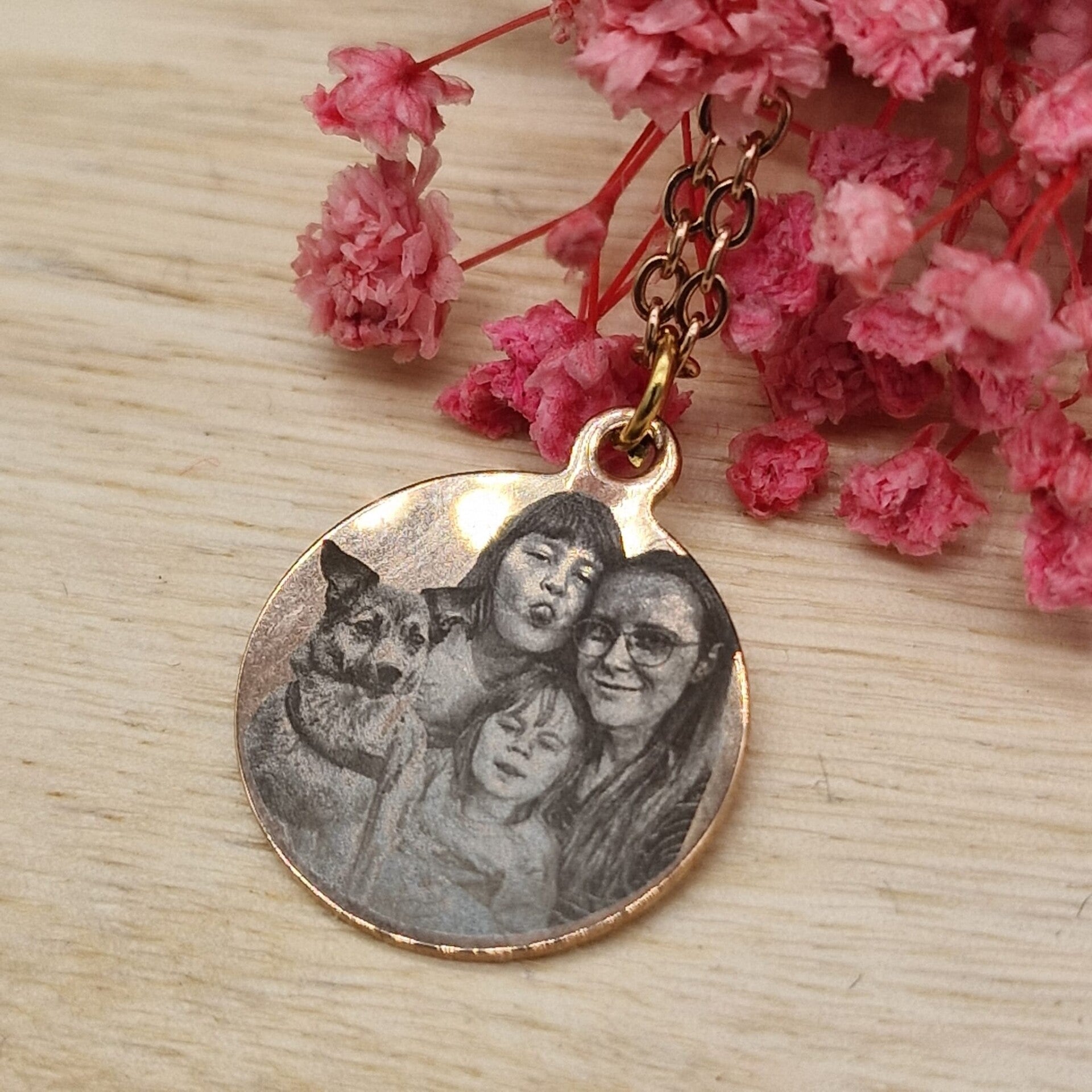 Elegante Fotogravur-Kette mit persönlichem Medaillon. Die feine Lasergravur macht jedes Schmuckstück zu einem einzigartigen Erinnerungsstück – perfekt für Familienfotos, Haustiere oder besondere Momente. Geliefert in einer hochwertigen Geschenkbox, ideal als persönliches Geschenk für jeden Anlass.
