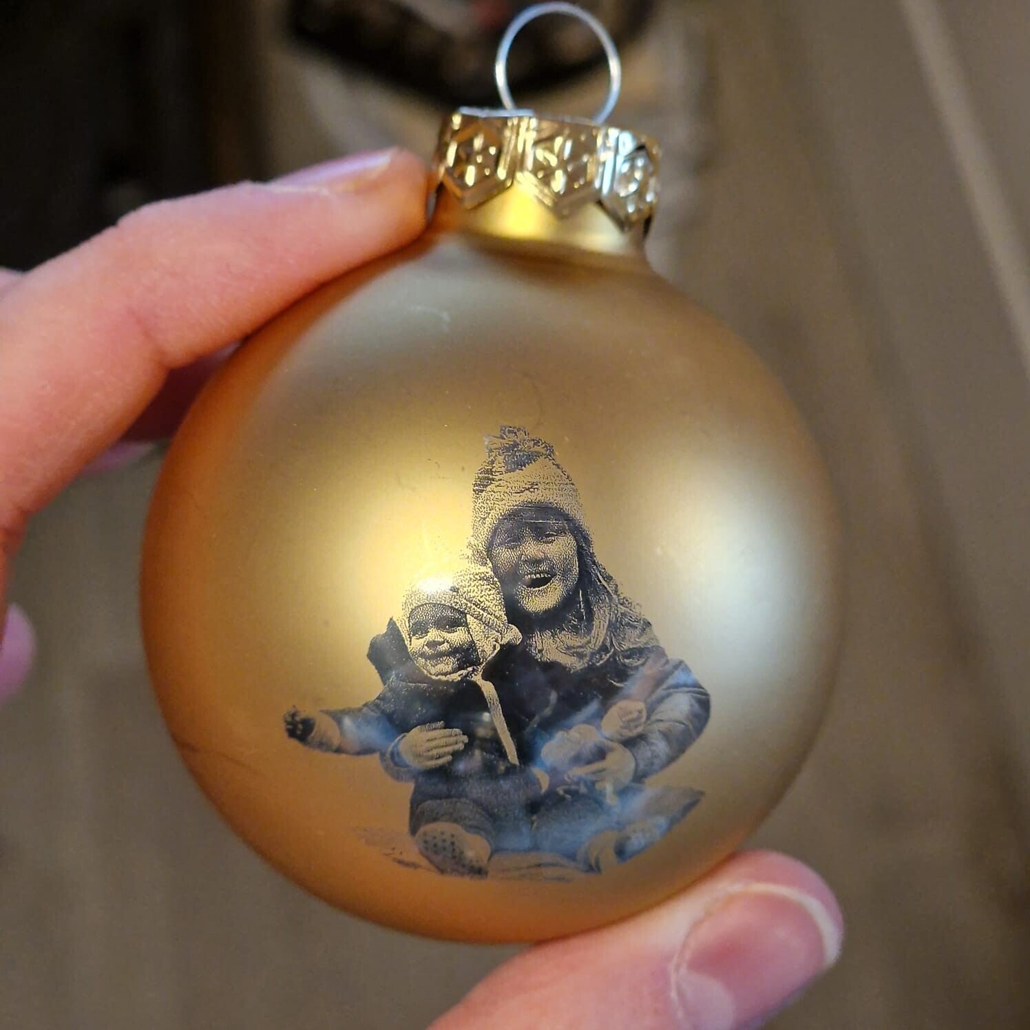 Personalisierte Weihnachtskugel mit hochwertiger Fotogravur. Die Kugel wird mit deinem Wunschfoto veredelt und sorgt für einen emotionalen Blickfang am Weihnachtsbaum. Ideal als Geschenk für Familie, Freunde oder als besondere Erinnerung an schöne Momente.