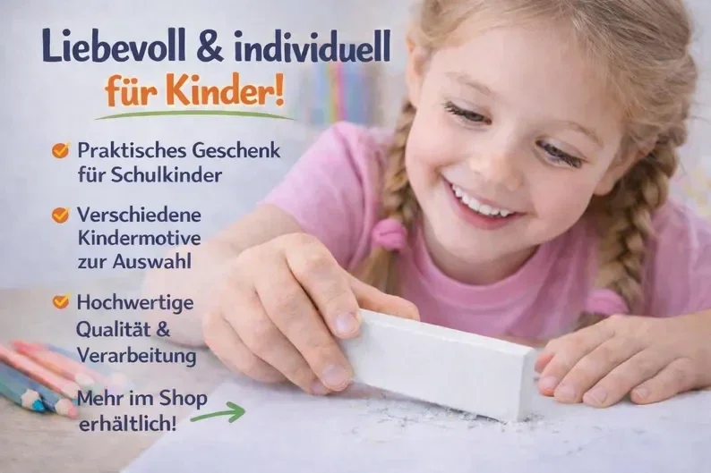✨ Personalisierter Radiergummi mit süßen Tiermotiven Dieser liebevoll gestaltete Radiergummi wird mit deinem Wunschnamen bedruckt und ist ein perfektes kleines Geschenk zur Einschulung oder für die Federmappe. 🎒 Besonders beliebt bei: -Kindergartenkindern -Grundschülern -Tierliebhabern -Einschulung & Schultüte 🖊️ Personalisierung Bitte beim Kauf angeben: • Wunschname • Wunschmotiv (siehe Bilder) • Wunschschriftfarbe 🦄 Verfügbare Motive ✔️ Pinguin ✔️ Wal ✔️ Faultier ✔️ Delfin ✔️ Schildkröte ✔️ Chihuahua ✔️ Katze ✔️ Eule ✔️ Hund ✔️ Alpaka ✔️ Giraffe ✔️ Schmetterling 📏 Produktdetails -passt perfekt in die Federmappe -hochwertiger UV-Druck -langlebig & abriebfest -in Deutschland gefertigt ❤️ -Maße: ca. 6,5 cm x 2,3cm x 1,3 🎁 Perfekt als -Einschulungsgeschenk -Schultütenfüllung -Mitgebsel -kleine Aufmerksamkeit ⚠️ Hinweis: Personalisierte Produkte sind vom Umtausch ausgeschlossen.