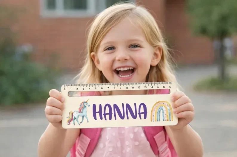 📚 Personalisierte Lesehilfe aus Holz – perfekt für die Einschulung Mache den Schulstart deines Kindes zu etwas ganz Besonderem! Unsere liebevoll gestaltete personalisierte Lesehilfe mit Namen hilft Kindern beim Lesenlernen und wird schnell zum täglichen Lieblingsbegleiter. Ob als Lesehilfe, Lineal oder Lesezeichen – dieses 3-in-1 Produkt ist praktisch, langlebig und gleichzeitig ein wunderschönes persönliches Geschenk. ✨ Deine Vorteile auf einen Blick ✔ Mit Namen personalisiert – jedes Stück ein echtes Unikat ✔ 3 in 1 Funktion – Lesehilfe, Lineal & Lesezeichen ✔ Hochwertiges Material – 4 mm starkes Sperrholz ✔ Perfekt zur Einschulung – ideales Geschenk für Schulanfänger ✔ Große Motivauswahl – über 47 Motive für Mädchen & Jungen ✔ Stabil & langlebig – für den täglichen Einsatz in der Schule 📏 Produktdetails -Maße: 18 cm x 7 cm x 0,4 cm -Material: Sperrholz (Holz, Naturprodukt) -Druck: einseitig -Optional: mit oder ohne Lineal wählbar 👉 Auswahlhilfe: • „Nur Schrift“ = ohne Lineal • „Schrift + Lineal“ = mit Linealaufdruck 🎁 Perfekt als Geschenk für: -Einschulung -Schulanfang -Schultüte -Geburtstag -Vorschule -Grundschule -kleine Leseratten 🌿 Hinweis zum Material Holz ist ein Naturprodukt – Maserung, Farbe und kleine Unregelmäßigkeiten (Astlöcher, feine Risse) machen jede Lesehilfe einzigartig. 🎨 Farbhinweis Die Farben können je nach Bildschirm und Licht leicht abweichen.